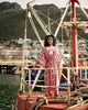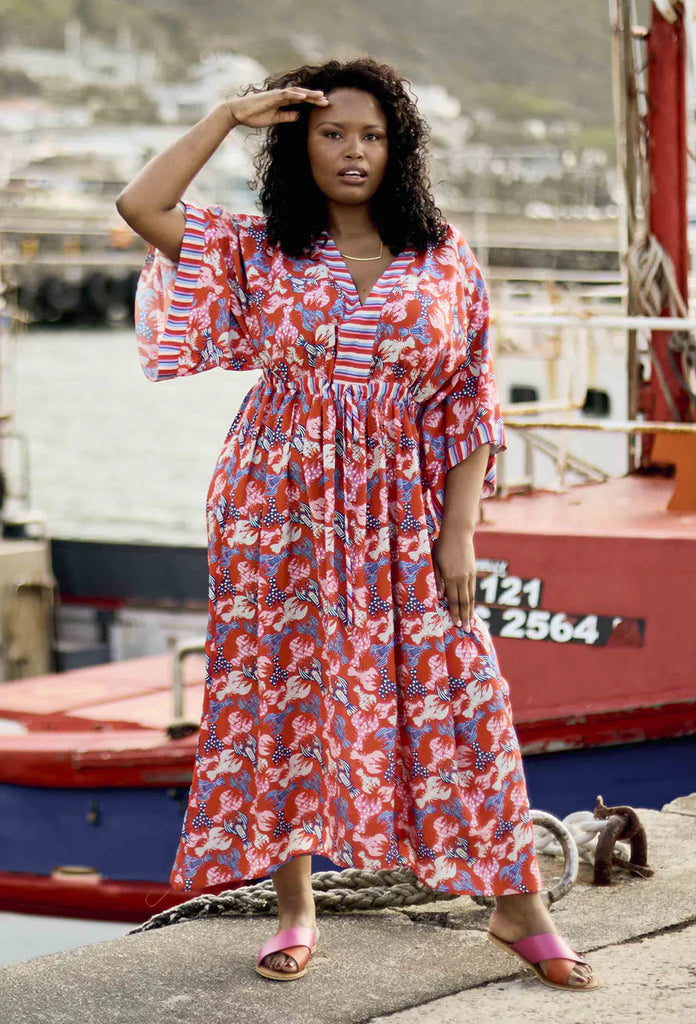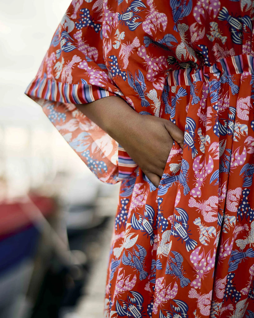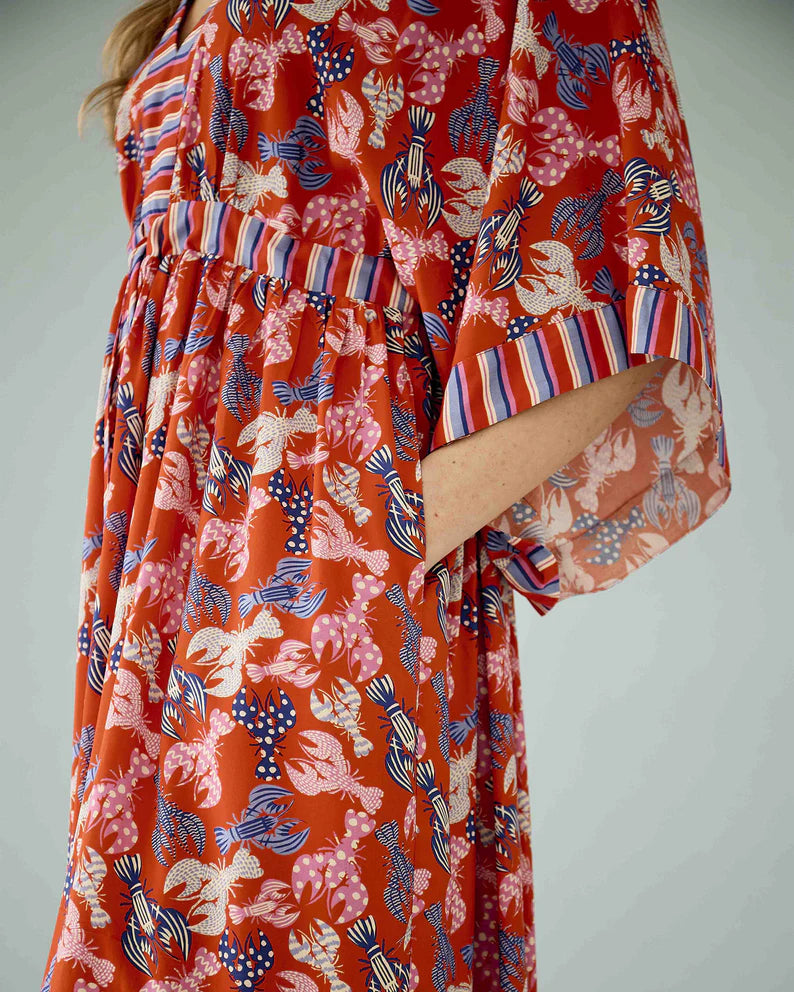 The Kimbo Dress in Pink Lobsters features a fun hanky hem and a skinny tie belt to shape your waist. Its kimono sleeves replace elastic cuffs, giving you freedom to move and enjoy your summer in style.