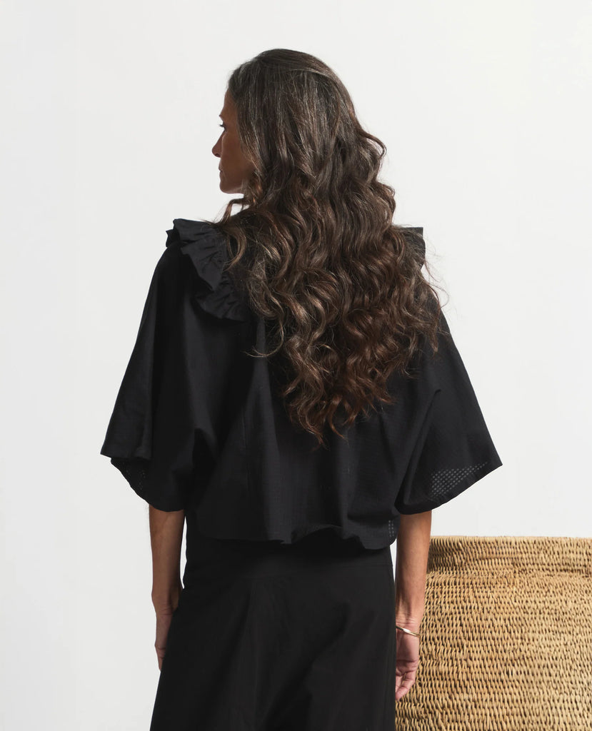 Loose Fit Summer Jacket with Frill Shoulders – Light and breezy, this summer jacket is designed in a relaxed fit for easy layering. Featuring playful frill details at the shoulders and wide half sleeves, it brings a touch of femininity to a casual silhouette. Perfect for warm-weather styling, it pairs effortlessly with dresses, shorts, or jeans for a chic, laid-back look.