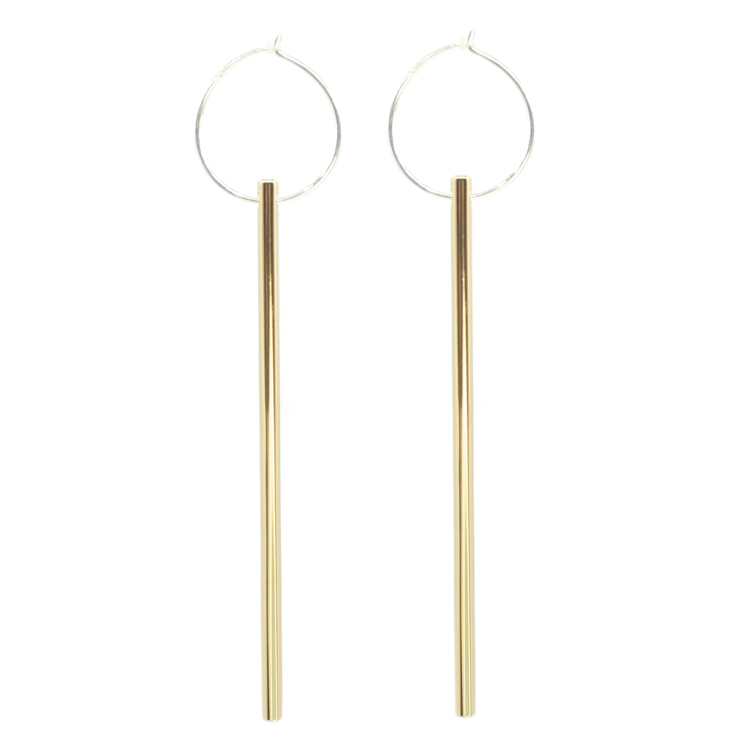 Two polished brass bars (50mm in length) on sterling silver hoops (13mm diameter).