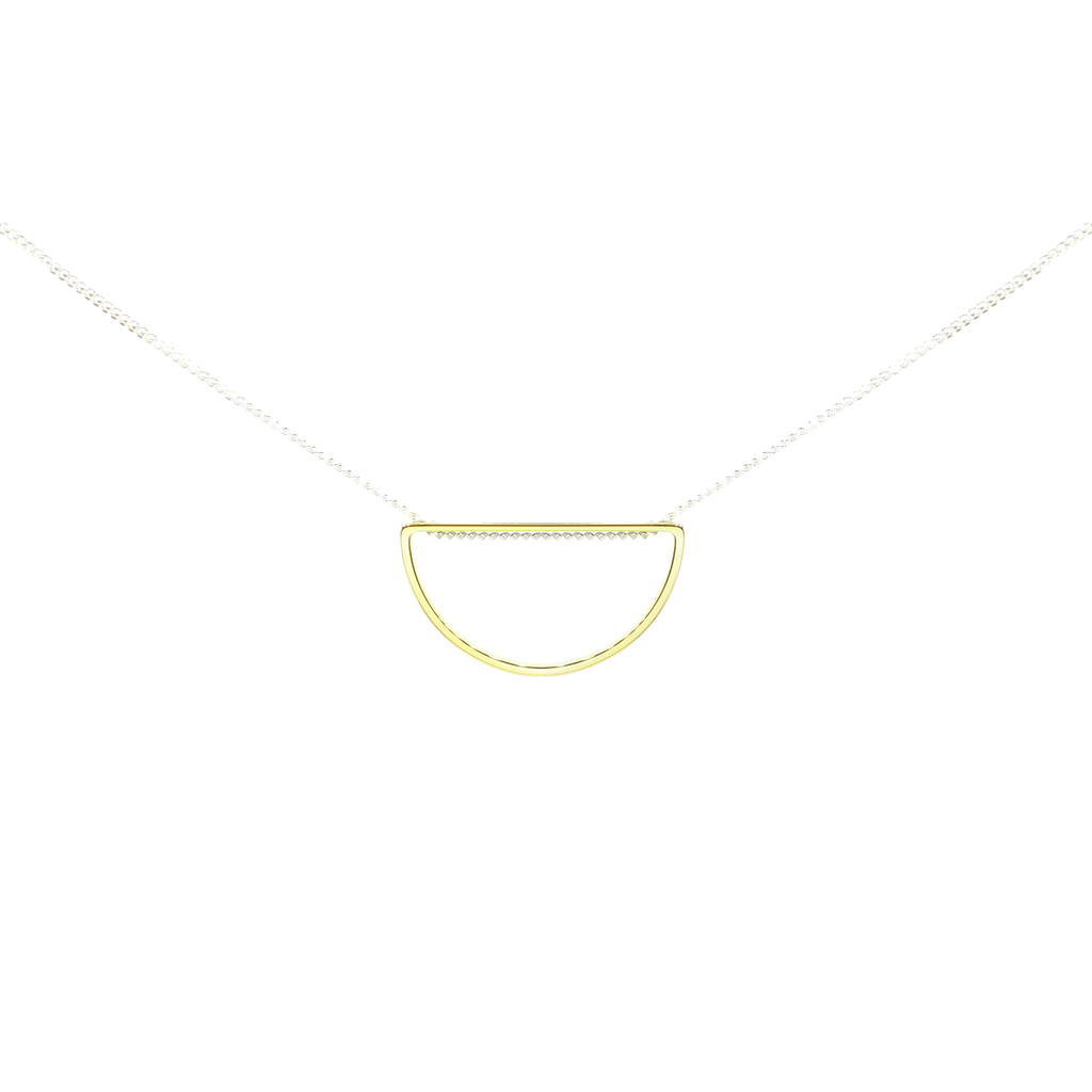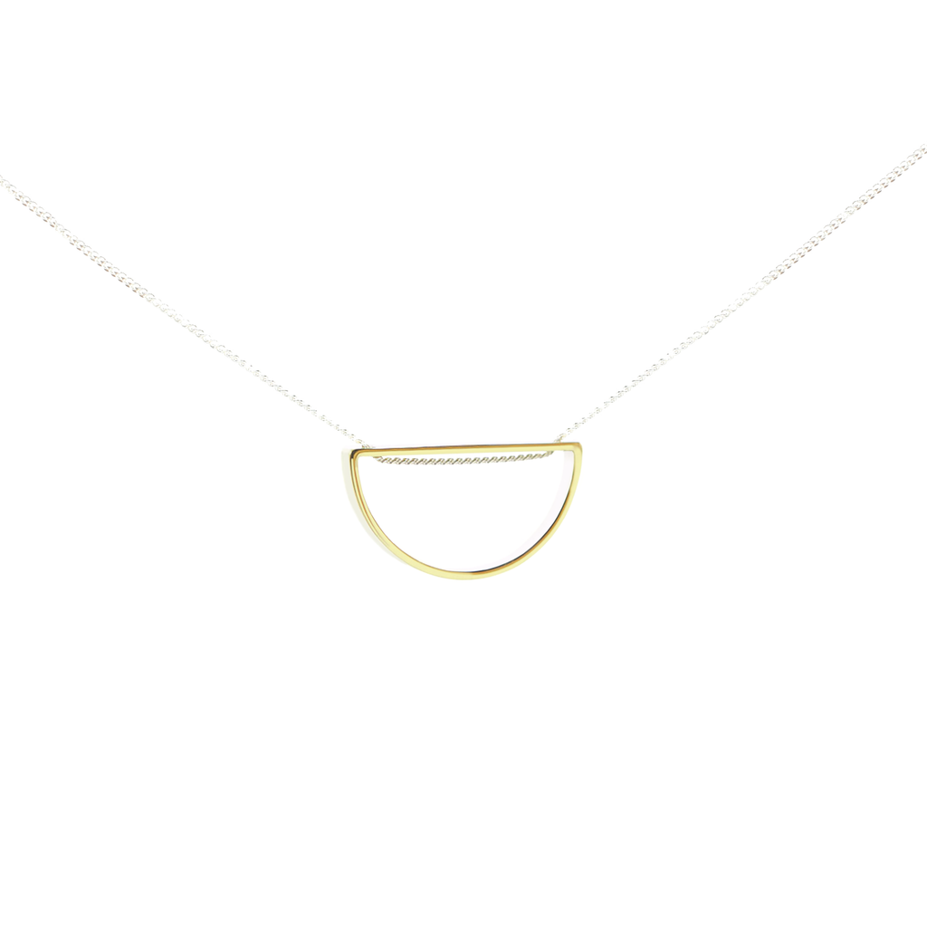 A polished brass half-moon (12mm x 22mm) on 450mm sterling silver chain.